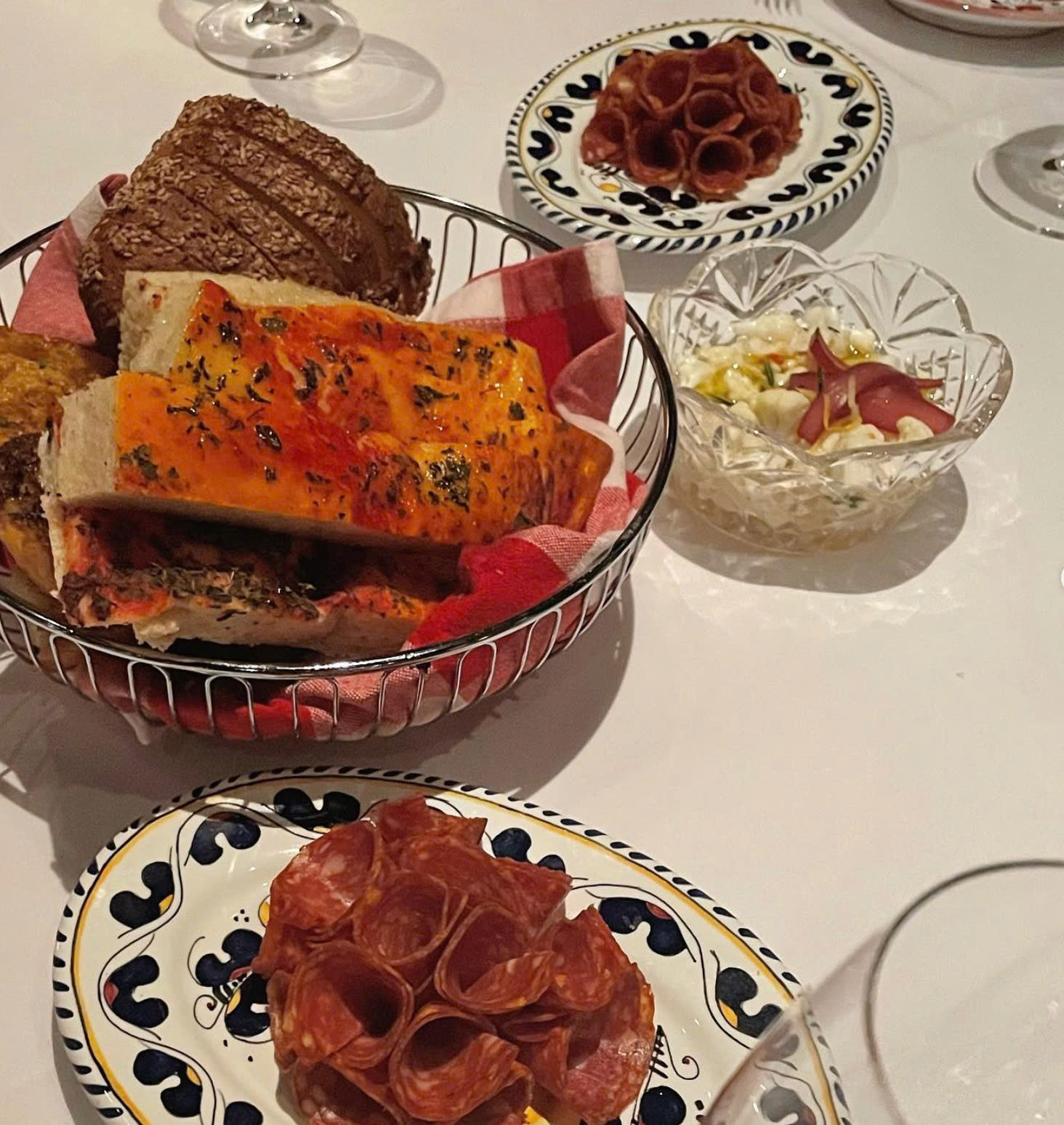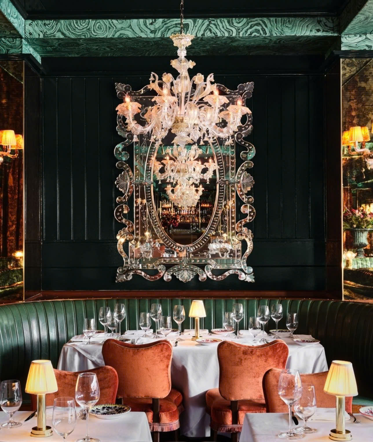 Carbone’s menu features signature dishes like Spicy Rigatoni Vodka, Veal Chop Parmesan, and Nutella Tiramisu, served with theatrical flair and tableside preparations by tuxedoed servers.